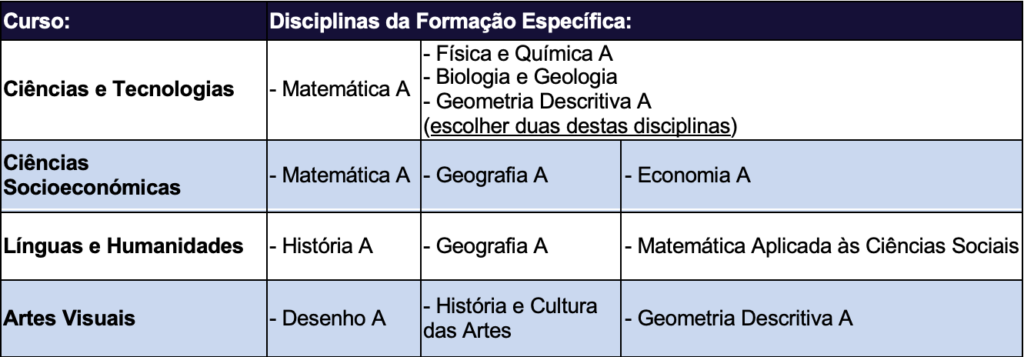 Informação para renovações de matrícula/novas candidaturas no Ensino Secundário: os alunos inscrevem-se nas seguintes disciplinas da Formação Específica de cada curso: